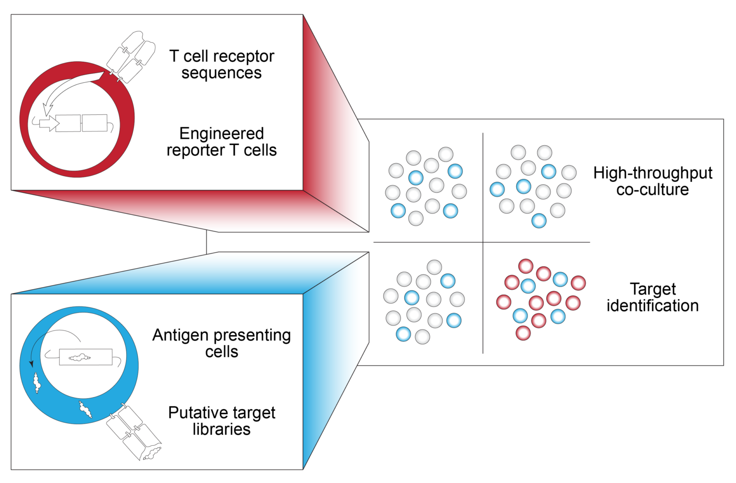 Identification of the target epitope(s) of a given T cell receptor (TCR) is a major challenge. In contrast to antibodies, which bind directly to their target, T cells recognize processed peptide epitopes presented by class I and II HLA molecules. Most attempts described in the literature to make this interaction amenable to high-throughput screening are based on engineered variants of the T cell receptors and/or peptide:HLA complexes, or a priori knowledge of the epitope and/or presenting HLA allele, limiting their ability to fully catalog physiologically relevant TCR:target interactions.